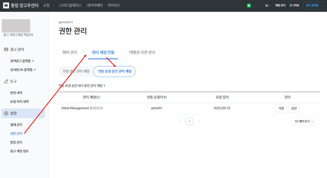 [통합 광고주센터]> [설정] > [권한 관리] > 관리 계정 연동 > 연동 요청 중인 관리 계정 > Adriel Management (뒤에 숫자 2,3,4,5 등이 붙어 있습니다) 승인 버튼 클릭