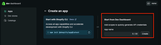 - 쇼피파이 개발자 대시보드에 접속해 주세요