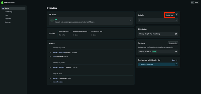- 만든 앱의 Overview 페이지에서 "Install app"을 눌러 주세요.