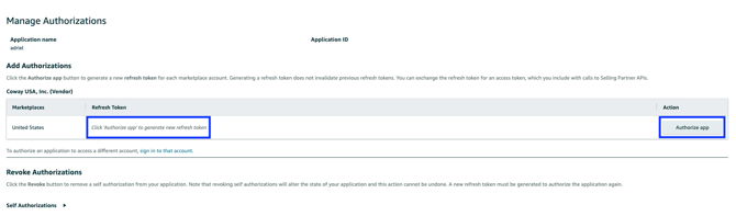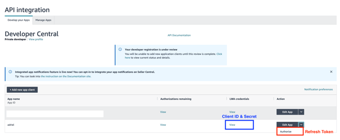- [API integration] > [Develop your Apps] > [LWA credentials] > "View"를 클릭해 주세요.